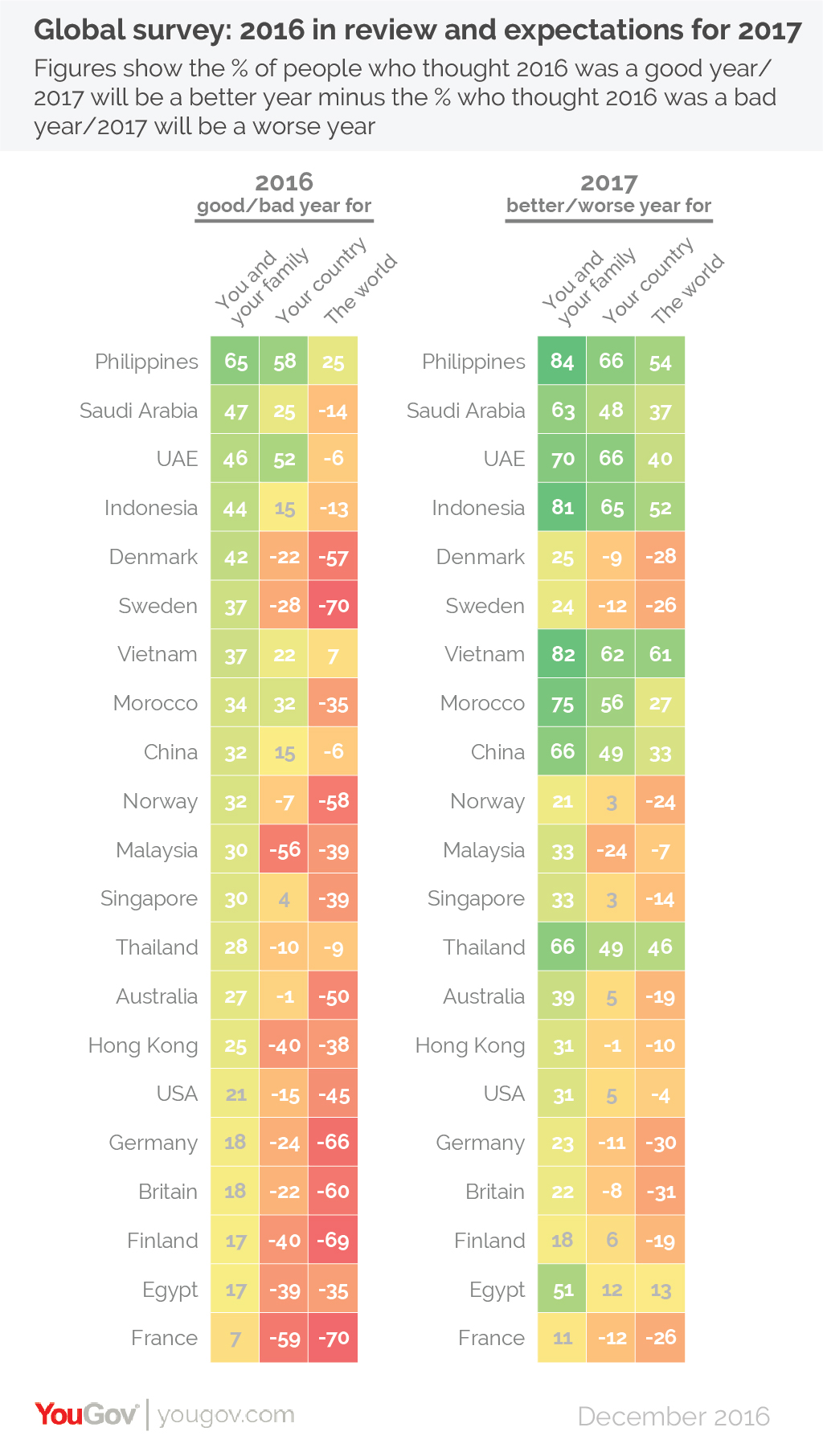 “As well as having some of the most negative views of 2016, the European nations surveyed also tend to have the most pessimistic expectations for 2017 as well. Whilst the seven European countries all have a net positive outlook in terms of prospects for themselves and their families, they are still lower than the scores from any other part of the world. They are all likely to have a more negative outlook for the future of their own countries, and are particularly pessimistic about how good 2017 is likely to be for the world,” said the poll analysis.
