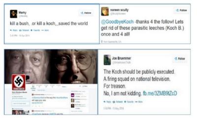 Holden said the result of the politically charged California case were threats on the Kochs. “The threats are serious and often horrific, ranging from threats to kill David and Charles, to threats of violence against their families, to threats to firebomb company facilities or disrupt company activities, to threats to injure David and Charles in other ways,” he wrote.