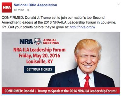 Officials said that Trump will speak at the National Rifle Association-Institute for Legislative Action Leadership Forum, as he did last year. Challengers Sen. Ted Cruz and Gov. John Kasich have not agreed to speak yet. Others speaking include: Sen. Marco Rubio, Indiana Gov. Mike Pence, Kentucky Gov. Matt Bevin, Kentucky Sens. Mitch McConnell and Rand Paul.