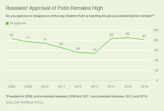 Putin, generally described in the U.S. press as a tyrant and killer, enjoys 81 percent approval, among the highest ratings he’s had in a decade, according to Gallup.