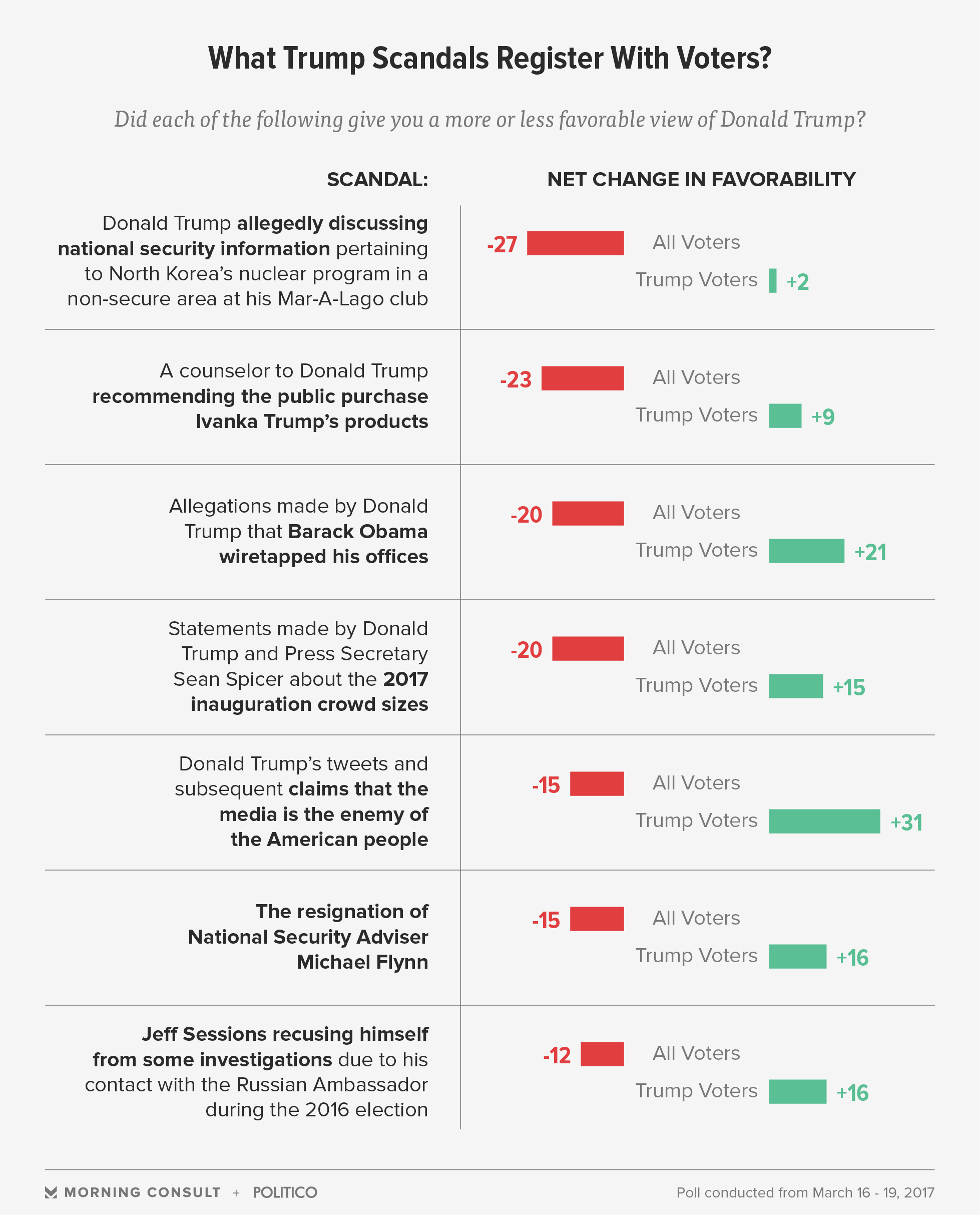The polling by Morning Consult tested the response of “Teflon Don” voters to several “scandals,” like the fight over Inauguration crowd sizes to his tweet that the media is the enemy of American people.