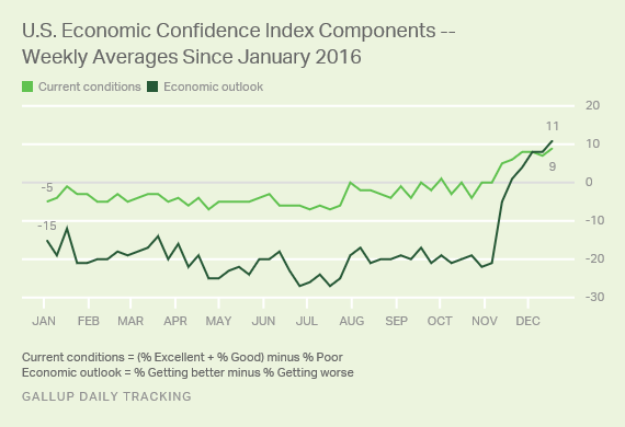 From Gallup: “U.S. Economic Confidence Index averaged +10 for the week ending Dec. 18, marking another new high in its nine-year trend.”