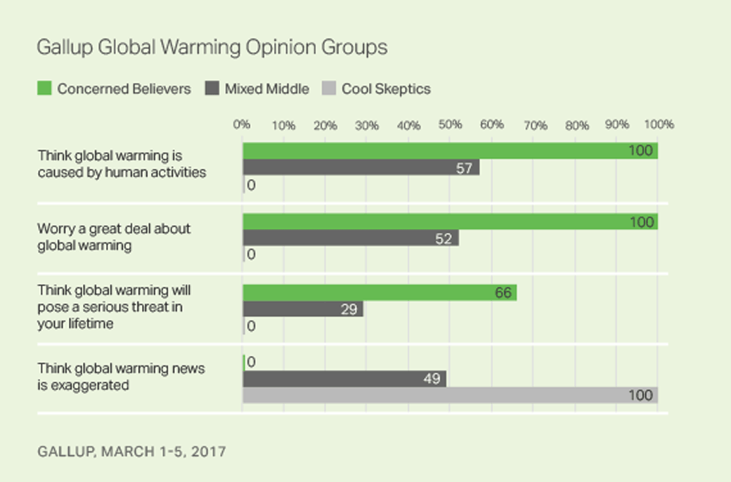 As in past surveys, there is a political divide between believers and skeptics. Said Gallup, “Nearly half of Concerned Believers, 47 percent, identify as Democrats, whereas 61 percent of Cool Skeptics are Republicans and the Mixed Middle is more independent than anything.”