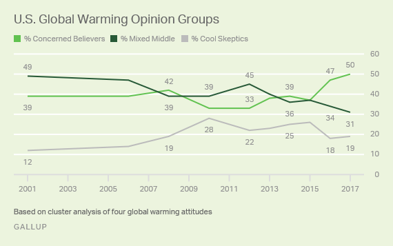 “That may be changing, however, as 50 percent of Americans now take all aspects of global warming seriously — classifying them as ‘Concerned Believers.’ That contrasts with most years from 2001 through 2016, when Gallup found the majority qualifying as ‘Mixed Middle’ or ‘Cool Skeptics’ on the issue.