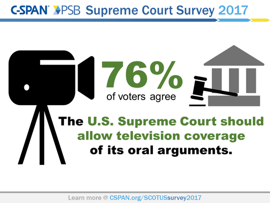 What’s more, the greatest percentage ever agreed with C-SPAN and other open meetings advocates that the time for live TV coverage in the Supreme Court is now. Some 76 percent want cameras, higher than in previous C-SPAN/Penn Schoen Berland surveys.