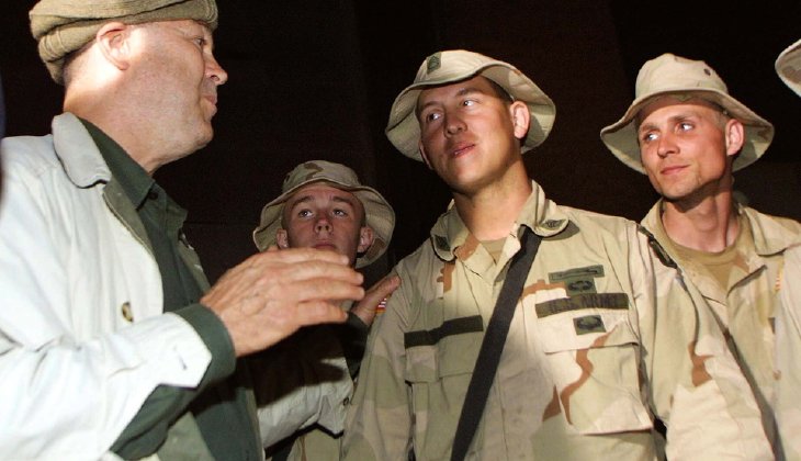 Representative Dana Rohrabacher, R-Calif., left, meets with U.S. soldiers during a congressional visit to Bagram Air Base in Afghanistan Wednesday, April 3, 2002. The delegation, which was on a fact finding mission to Afghanistan, stopped at Bagram to express their support for U.S. troops in the field. (AP Photo/Greg Baker)