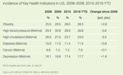 “Since 2008, obesity has increased by nearly three points to 28.3 percent, and lifetime diagnoses of diabetes have increased about one point to 11.5 percent, a statistically significant climb. Self-reports of clinical diagnoses of depression have also edged up since 2008,” said Gallup.
