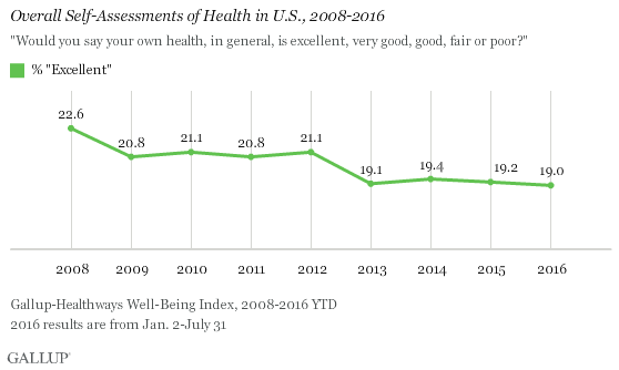 Gallup, which this week has been releasing surveys on the nation’s well-being, said in its latest that 22.6 percent of Americans during Bush’s last year said their health was excellent. Since, however, has steadily declined and is now just 19 percent.
