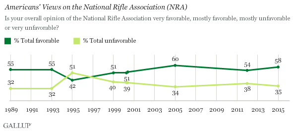 “Even after shootings nationwide, Americans overall still have a favorable opinion of the NRA, as they typically have, suggesting that the public may not be specifically blaming the organization for the crimes of those who commit mass shootings,” said Gallup.