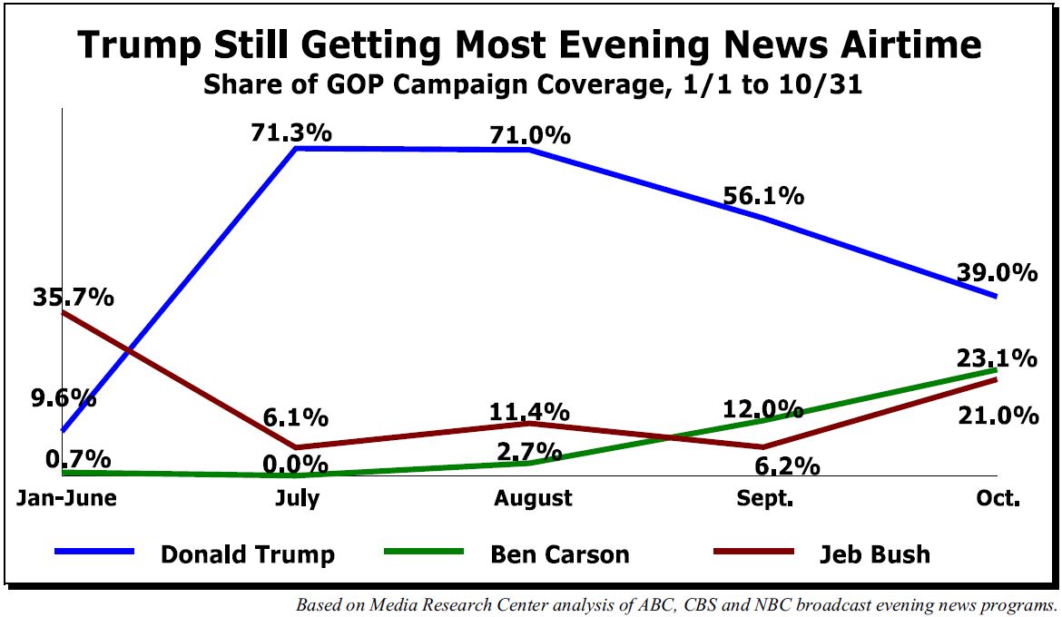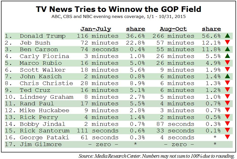 Since the race has heated up, TV news has focused on Trump and Carson, boosting their on-air time while cutting that of Bush and 11 other contenders and not giving former Virginia Gov. Jim Gilmore a second of attention.