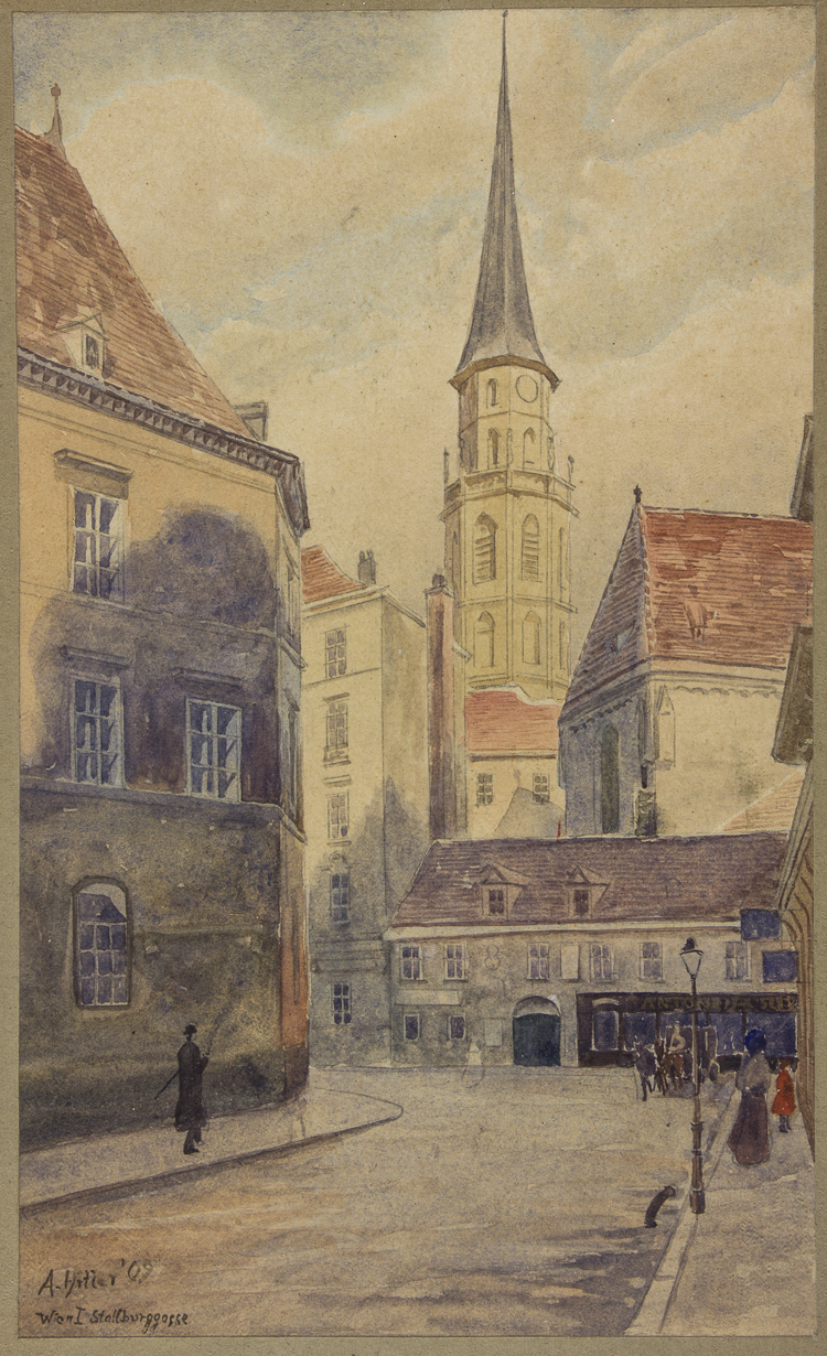 “Hitler drew some of the elements, mainly architectural lines, in pencil, and used earth tone washes for coloration with black lines to accentuate details. As is almost always the case with Hitler’s works, his perspective is not accurate with buildings not bearing the correct scale and angles for their location. Particularly telling are his renditions of the human form — faces are never shown, torso and limb lengths are incorrect, and the perspective employed in the placement of the figures is incorrect.”