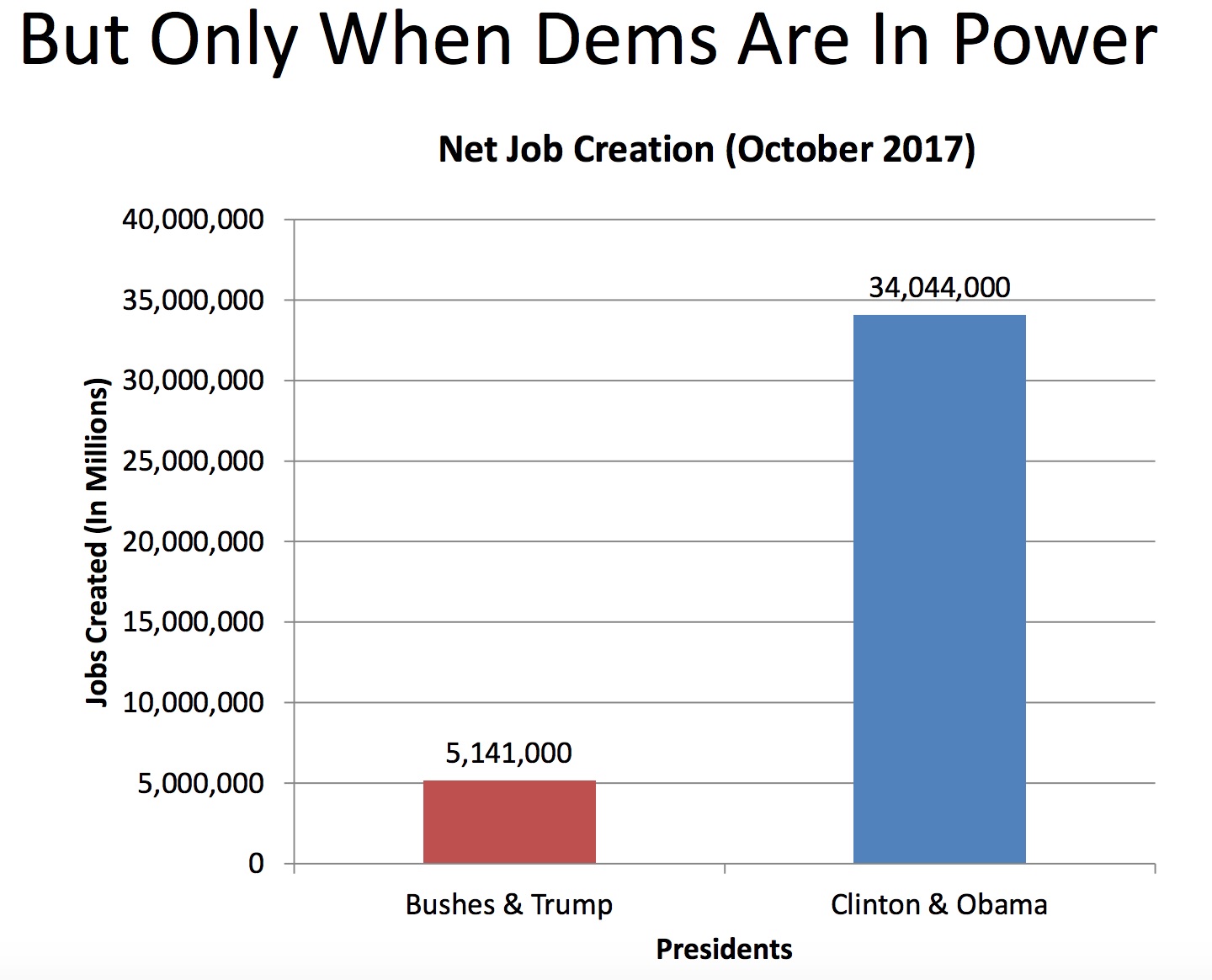 - Under the GOP presidents, 5.1 million net jobs were created. Under the two Democrats, 34 million jobs were created.