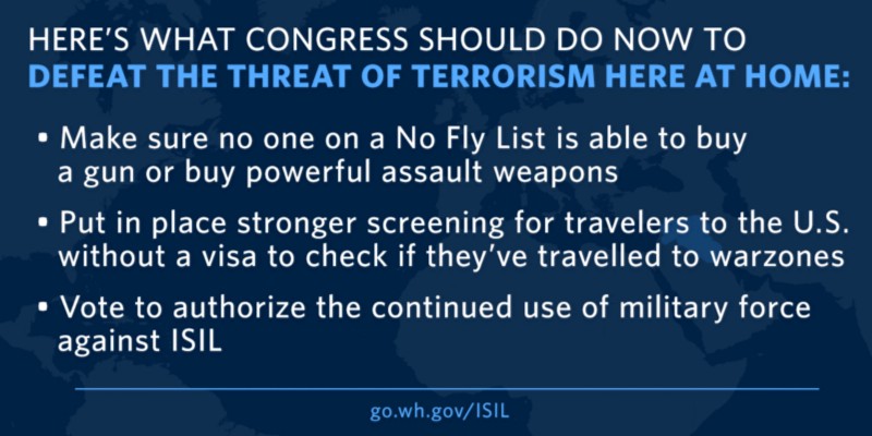 “We also need to make it harder for people to buy powerful assault weapons like the ones that were used in San Bernardino. I know there are some who reject any gun safety measures. But the fact is that our intelligence and law enforcement agencies — no matter how effective they are — cannot identify every would-be mass shooter, whether that individual is motivated by ISIL or some other hateful ideology. What we can do — and must do — is make it harder for them to kill.”