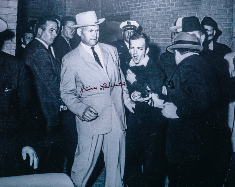 Photo of JFK assassin Lee Harvey Oswald being shot signed by the officer leading Oswald through Dallas Police HQ.