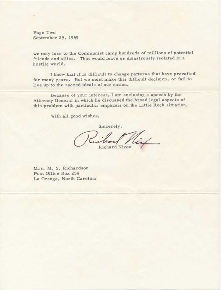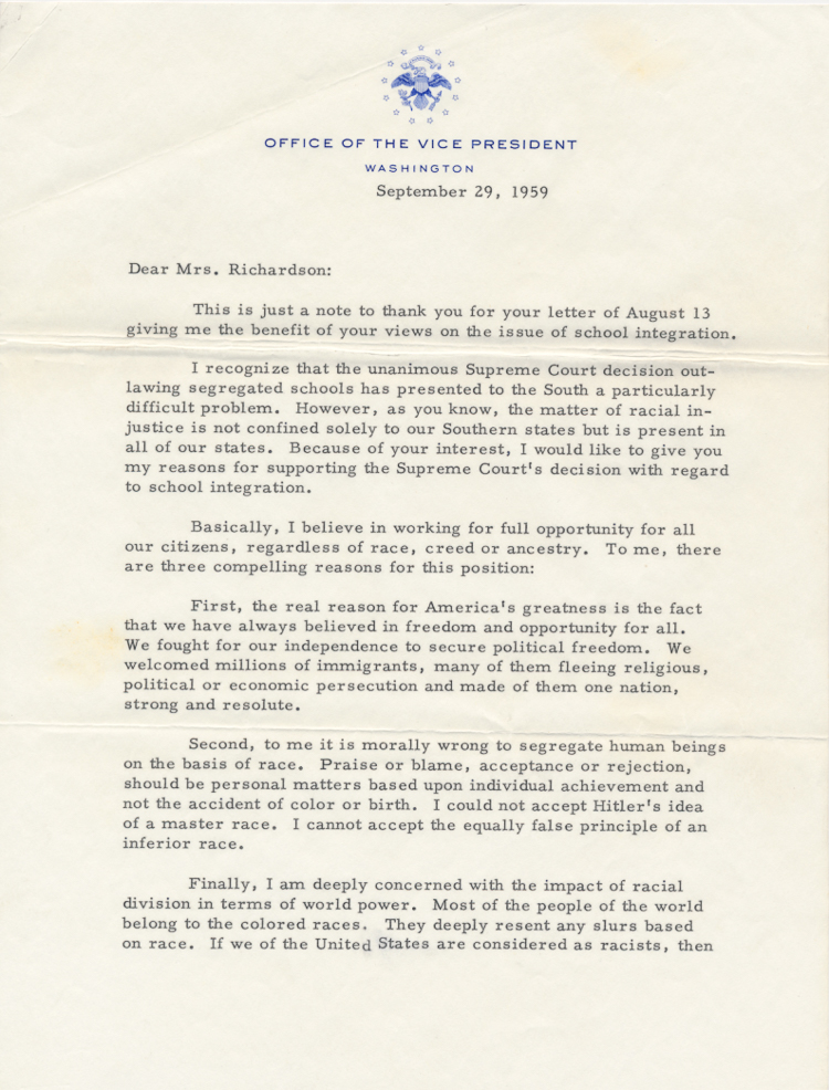 In the letter written on vice presidential stationary, Nixon explained to a North Carolina woman his reason for supporting school integration with a much broader endorsement of treating everyone equally.