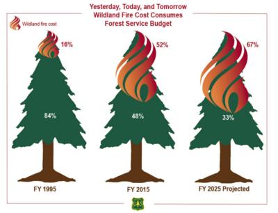 In a 16-page budget report, Ag’s U.S. Forest Service said that spending on fire suppression for the first time this year has consumed more than 50 percent of its budget and could reach 67 percent, or nearly $1.8 billion by 2025.