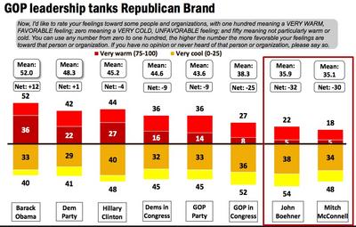 On the thermometer scale pollsters like to use, it wasn’t better, with the two GOP leaders even trailing “GOP in Congress,” Hillary Clinton and “Dems in Congress.” For Boehner, the warm rating was 22, the cold 54. McConnell was worse, with an 18 on the warm rating.