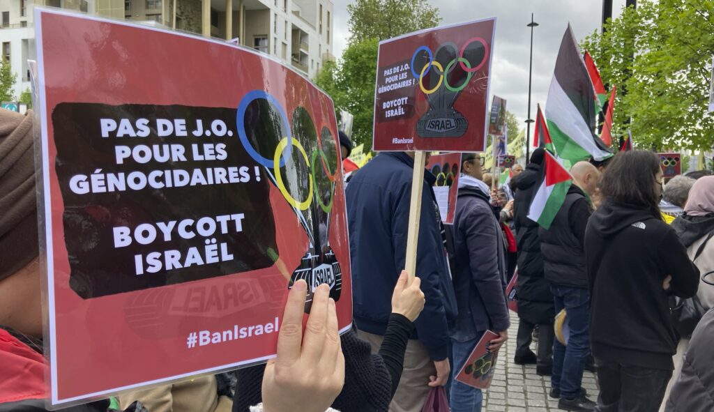 Protesters assembled outside the headquarters of the Paris 2024 Organizing Committee for the Olympic and Paralympic Games, demanding Israel receive the same punishment, citing its war in Gaza with Hamas terrorists.