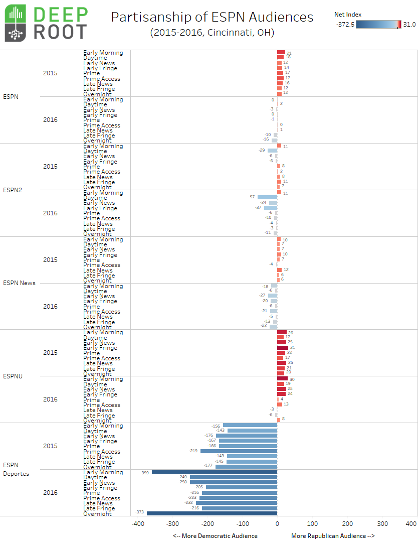 ESPNU, on the other hand, “was the only network that retained its mostly Republican audience,” while the Spanish-language network ESPN Deportes, “became even more Democratic in 2016 than it already was in 2015,” the group reported.