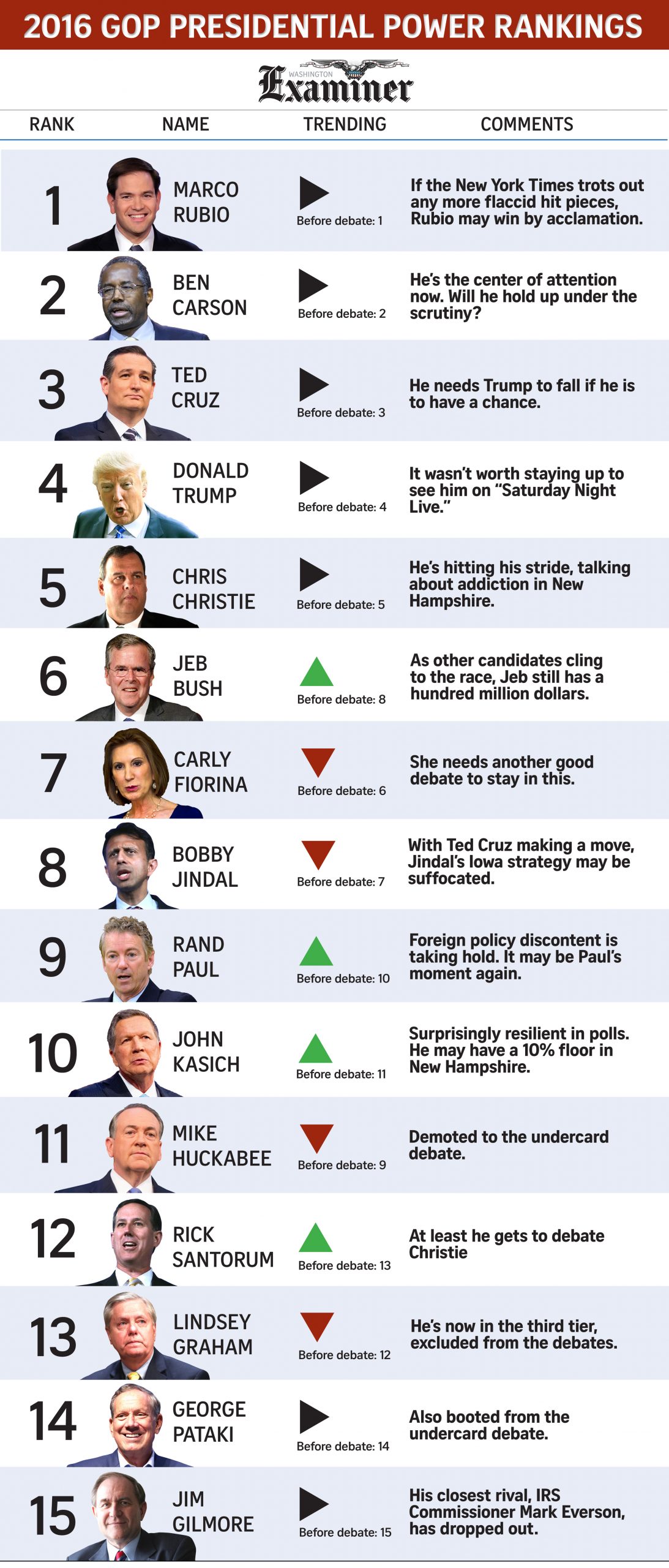 Get ready for drop-out season. The Fab Fifteen will start shrinking in the wake of Tuesday night’s debate. Here’s who’s shaping the race right now.