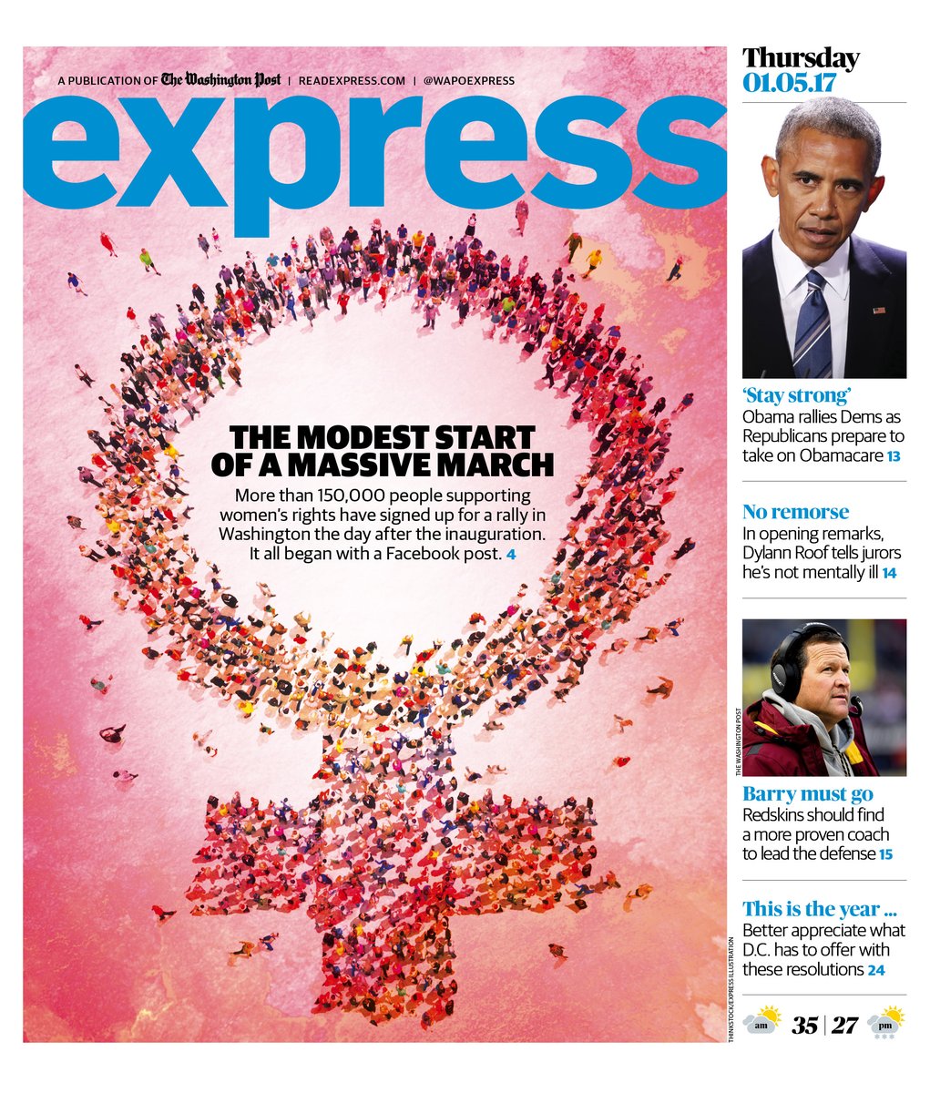 The Express’ headline read, “The modest start of a massive march.” The subhead read, “More than 150,000 people supporting women’s rights have signed up for a rally in Washington the day after the inauguration. It all began with a Facebook post.”