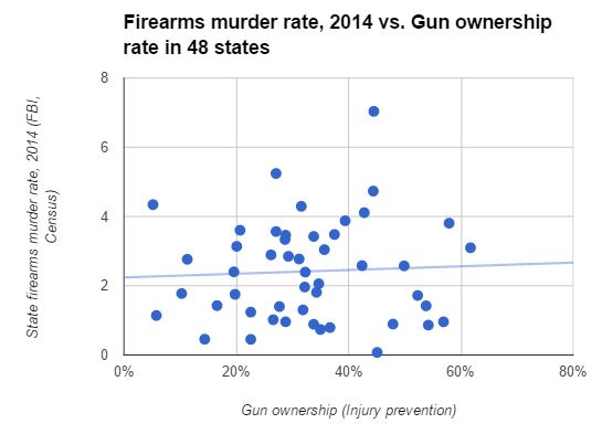 The other day, I published this scatter-graph of 48 U.S. states to show there is no significant correlation between gun homicides and gun ownership by state. The plot relies on the recently released FBI data for 2014 (the FBI lacks data for Alabama and Florida). The state gun ownership rates come from a study published this summer by Injury Prevention.