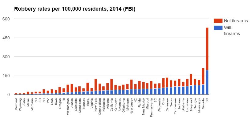 And here’s a more detailed look at gun and non-gun robbery rates in 48 states (the FBI has data for Florida and Alabama this time, but not Illinois and Hawaii) ranked from right to left by the incidence of robberies committed with firearms.