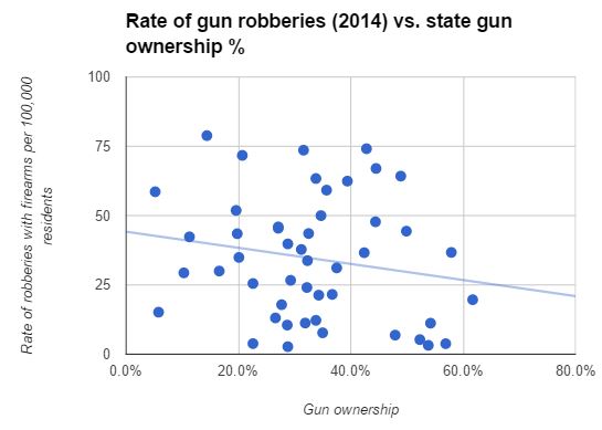Note that although the slope of the trend line is negative this time, the correlation is too weak to be considered significant. It overstates the case to say that more guns mean fewer gun robberies.