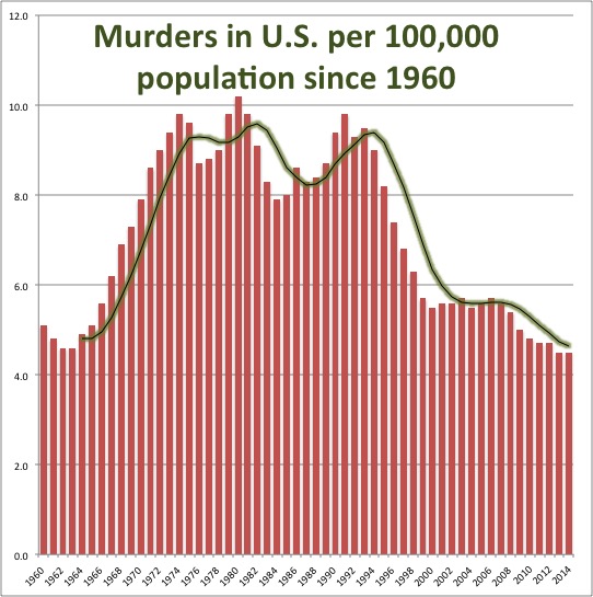 If the editors meant to refer to a gun-death epidemic or a mass-shooting epidemic, here’s a relevant bit of information: Per-capita murders in the U.S. are at their lowest level since FBI records began, and they are trending downwards. The Times editors write “motives do not matter to the dead.” I would add that “weapons of choice do not matter to the dead.” So, here’s a chart of all murders in the U.S, taken from FBI data.