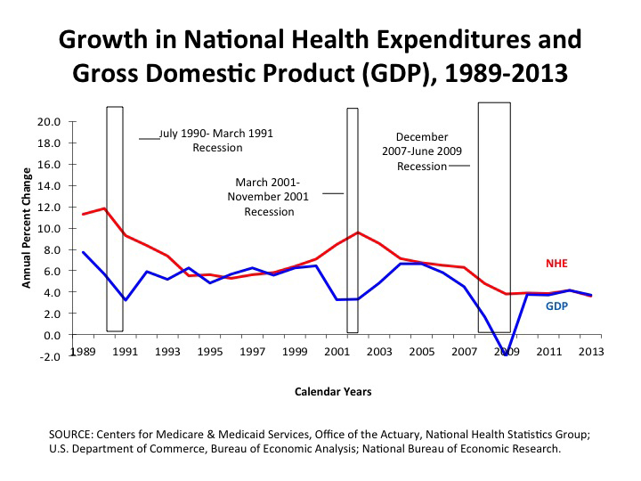 For now, CMS actuaries are remaining cautious about drawing such a conclusion. In 2013, the authors of the report note, health spending grew at the same pace as the overall economy, which is consistent with historical experience. “Growth in health spending and GDP have tended to converge several years after the end of economic recessions,” they wrote.