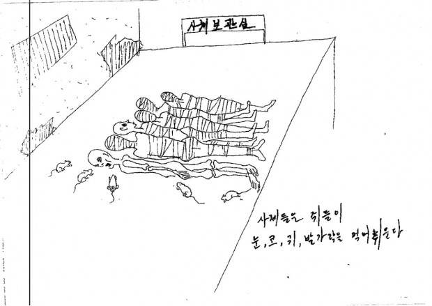 Anyway, for no reason at all, here is a firsthand account of life inside one of the Hermit Kingdom’s many, many, many gulags. The following sketches come via Kim Kwang-il, a defector who reportedly spent nearly three years in a prison camp for the crime of smuggling pine nuts. His sketches featured prominently in a 2014 United Nations commission report.