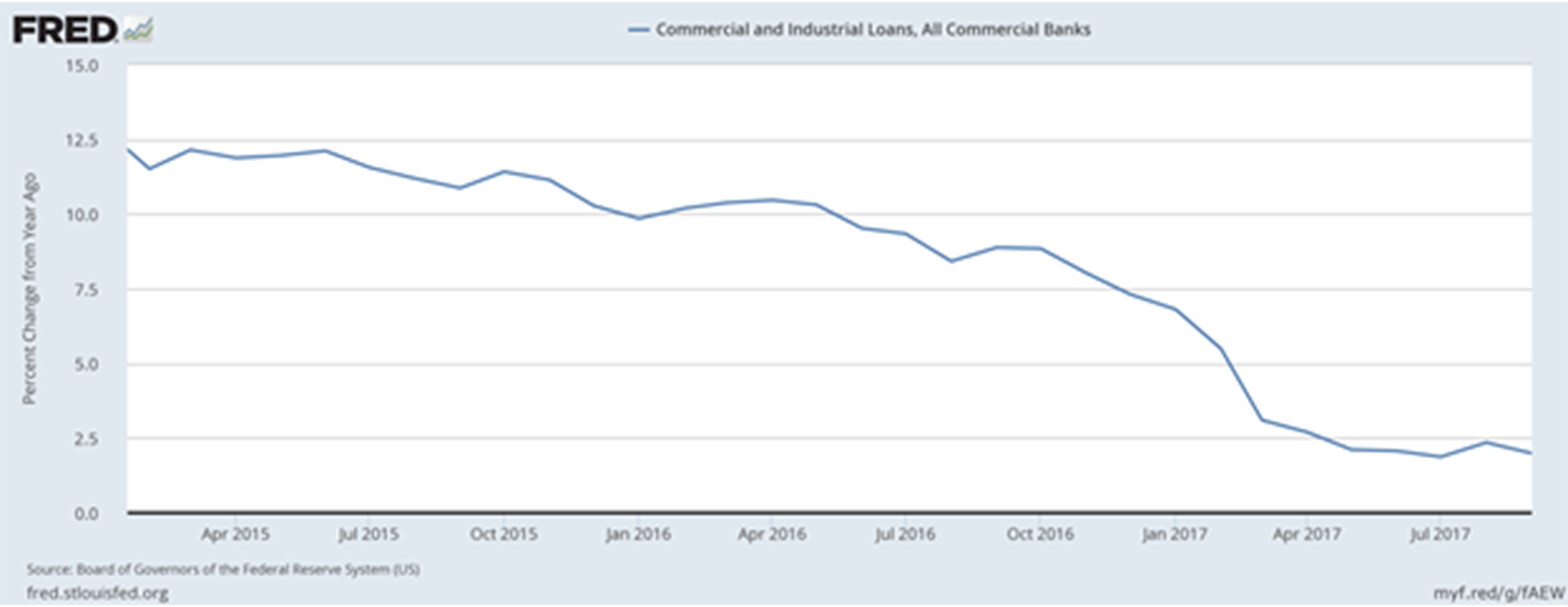 So what has happened to bank lending activity since? Do higher excess reserves match lower levels of lending activity? The accompanying chart, provided by the Federal Reserve Bank of St. Louis, reports the year-over-year growth of commercial and industrial loans made by the U.S. banking system from 2015 through August 2017. Sure enough, lending activity has fallen, especially after March 2017 when the excess reserve interest rate was raised from 0.75 percent to 1.00 percent.