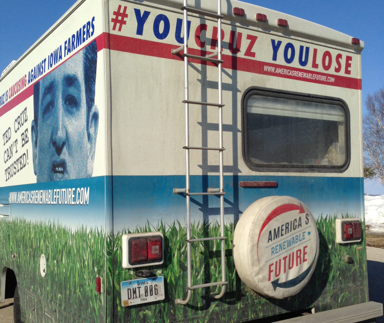 He pointed out towards the ethanol-lobby’s “You Cruz You Lose” truck in the parking lot and said, “As you all are aware, there are a bunch of lobbyists and a bunch of Democrats spending millions of dollars trying to convince the people that I am somehow opposed to ethanol. It is complete and utter nonsense. I very much support ethanol, I just oppose Washington.”