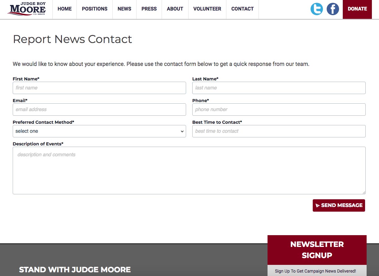 Moore’s campaign website launched a page Wednesday encouraging voters to “report inappropriate news organization contact” in order to help the 70-year-old former judge combat allegations he pursued intimate encounters with teens and minors when he was in his 30s.
