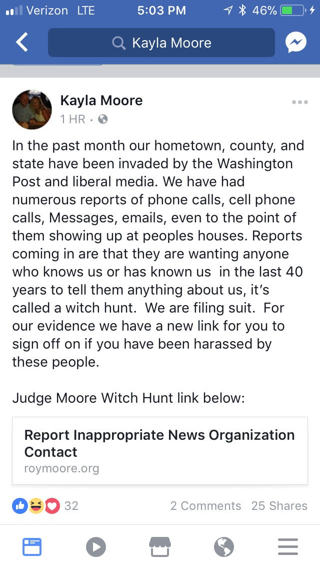 “Upon learning that Washington Post reporters were contacting people she knows for this article, Moore on Wednesday posted one of the reporters’ personal cellphone numbers on her Facebook page, and a commenter posted a copy of that reporter’s résumé, which included her home address,” the paper reported this week