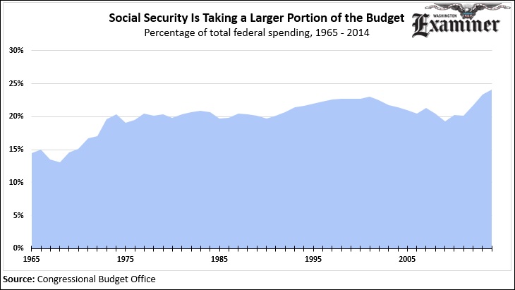 Social Security is swallowing ever-larger portions of the federal budget. By 1965, when President Johnson was signing his Great Society legislation, Social Security took up less than 15 cents of every federal dollar spent. Soon, the program will take up more than a quarter of every federal dollar.