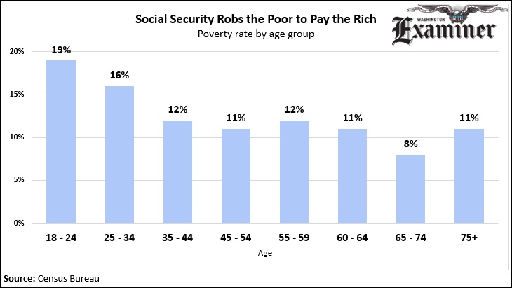 The goal of the program is to ensure the elderly aren’t living in poverty. But what about the age group with the highest level of poverty, 18 to 24-year-olds? Those just at the start of retirement, aged 65 to 74, have the lowest level of poverty, at 8 percent. Those over the age of 75 experience slightly higher rates of poverty, at 11 percent, but still well lower than the almost one in five rate of 18 to 24-year-olds.