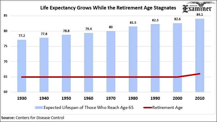 Penicillin was only 6 years old when Social Security became law. Since then, incredible advances in medical technology have expanded longevity. In 1930, someone who was age 65 was only expected to live to age 77. As of 2010, a 65-year-old is expected to live until age 84. Despite all the medical progress, Social Security’s retirement age has mostly been inflexible. Those retiring in 2010 had to be 66 years or older, rather than the historical 65.