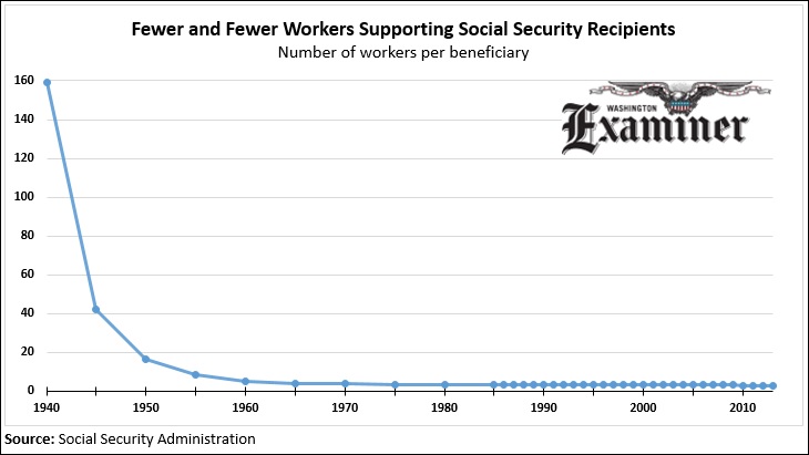 With the growing elderly population, there are fewer and fewer workers to support each Social Security recipient. The ratio of workers to Social Security beneficiaries continues to shrink. For the past 50 years, fewer than four workers have supported each beneficiary. At the close of World War II, there were 42 workers per beneficiary. Now, just 2.8 workers support each Social Security beneficiary, and the number will shrink further.
