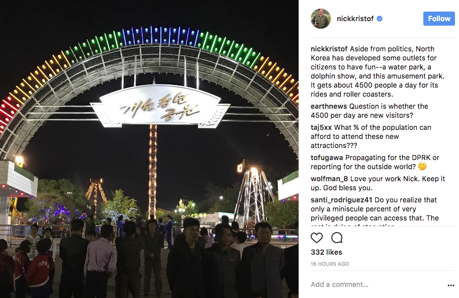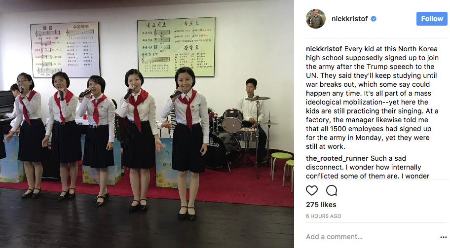 On Friday, for example, Kristof posted a photo of North Korean students to his Instagram account with the accompanying caption, “Every kid at this North Korea high school supposedly signed up to join the army after the Trump speech to the UN.”