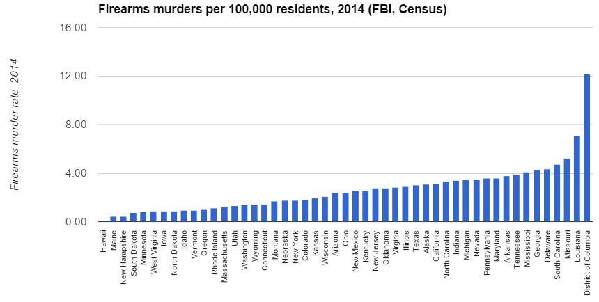 That looks a lot like a shotgun blast, because at least in 2014, the statistical case that high state gun ownership translates to more gun homicides was non-existent. This is what happens when you just look at the relevant numbers instead of cherrypicking whatever numbers tell the story you want. There’s no significant statistical correlation here, whether or not you choose to include D.C. (the outlier, way up above the others). And in fact, when you just look at last year’s gun homicide rate by state (calculated from FBI and Census data), you see that many of the states that they claim have low “gun death” rates actually have comparatively high rates of gun murders. New Jersey, for example, had a much higher gun murder rate than Idaho and Vermont.