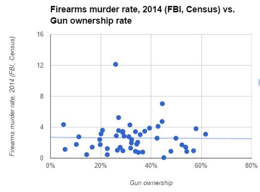Now look at this chart. Each state is again represented as a dot, but this measures the gun murder rate in the 48 states that submitted timely FBI reports for 2014 (Alabama and Florida did not). The number of gun murders per 100,000 residents is plotted against each state’s gun ownership rate as found in a 50-state study for the publication Injury Prevention.