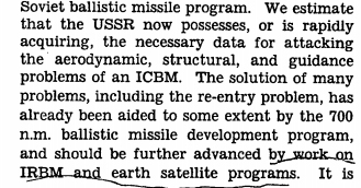 By successfully testing shorter range ballistic missiles, the CIA is saying, the Soviet Union has addressed many of the challenges in perfecting a long-range missile capability. As the CIA notes, the “aerodynamic, structural, and guidance problems” of an ICBM program are similar to the physics of a short range or intermediate range ballistic missile program. The CIA report also notes that with each test of “IRBM and earth satellite programs,” Soviet knowledge of the physics of ballistic missile capabilities grows.