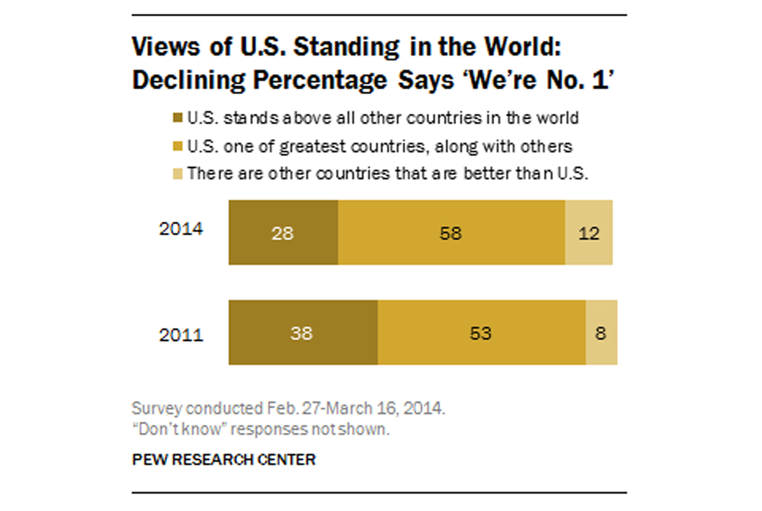 The number of Americans who believe that the U.S. “stands above all other countries” has dropped to just 28 percent, a 10-point decline from three years ago, according to the Pew Research Center.