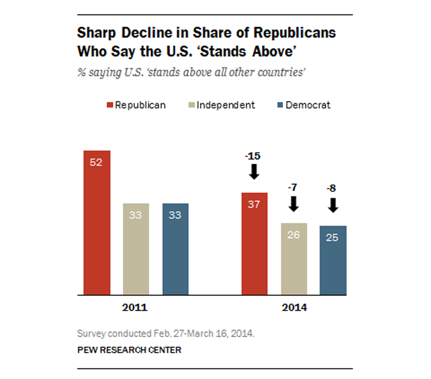 But here’s something: A sharp drop in opinion of the U.S. comes from the poll’s self-identified Republicans. Only 37 percent now view the U.S. as the greatest country on Earth, a 15-point drop from 2011.
