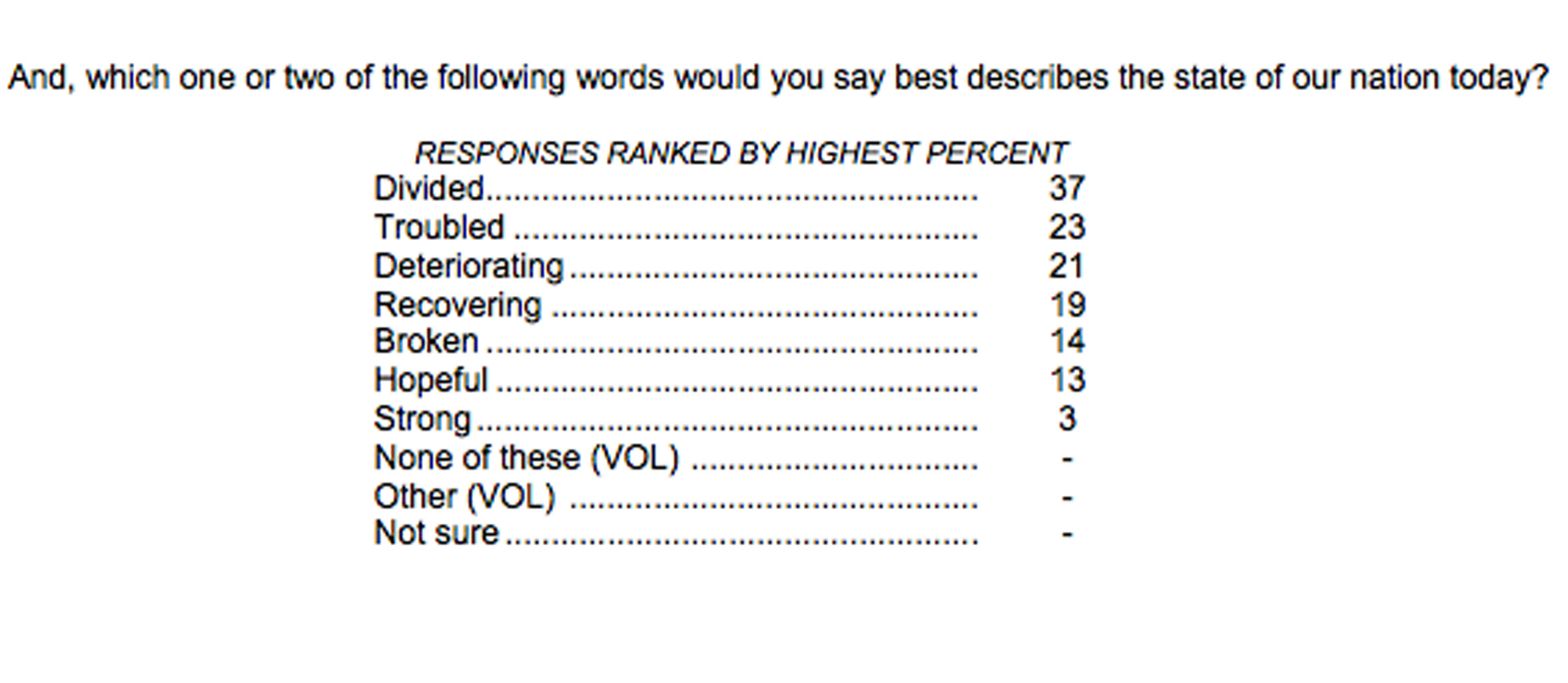 The most popular choice is “divided” with 37 percent of the vote, followed by “troubled” at 23 percent, and “deteriorating” at third place with 21 percent.