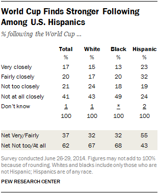 “Another group paying very close attention to the World Cup but being pretty casual about politics? Hispanics. Twenty-three percent are watching soccer very closely, and 55 percent are watching it at least fairly closely — compared to 32 percent of whites,” the report added.