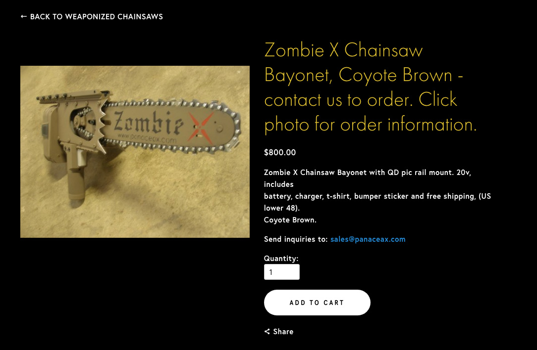 One company, Panacea X, which specializes in survivalist tools, has an entire line of “weaponized chainsaws.”
