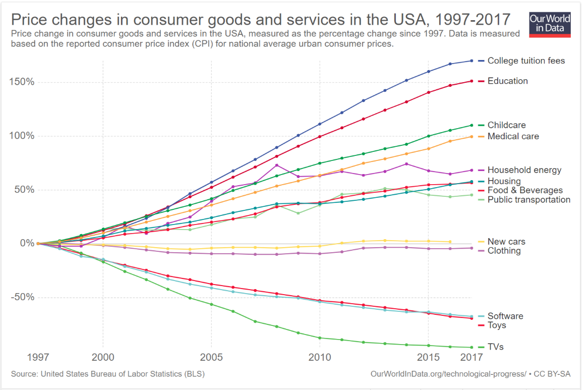 For example, this trend can be seen in markets from TVs to college, as this Bureau of Labor Statistics chart wonderfully illustrates.