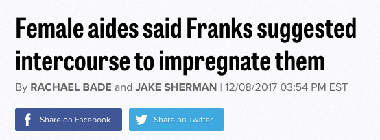 “Female aides said Franks suggested intercourse to impregnate them,” read the headline to a story authored by Rachel Bade and Jake Sherman.